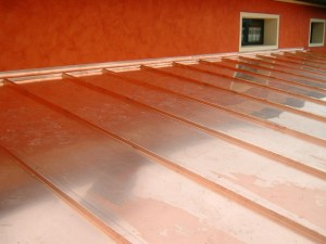 Intervento presso abitazione privata. Posa di lastre grecate in rame, precedentemente realizzate a misura presso la nostra officina, comprensive di scossaline di collegamento.