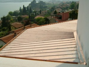 Intervento presso abitazione privata. Posa di lastre grecate in rame, precedentemente realizzate a misura presso la nostra officina, complete di grondaie e tubazioni di scolo. La particolarità e difficoltà di questo intervento è data dalla speciale frammentazione delle lastre, prima tagliate e poi grecate su misura; in questo modo sono state adattate alla sagoma esagonale e irregolare della costruzione, pur mantenendo un ordine di grecatura.